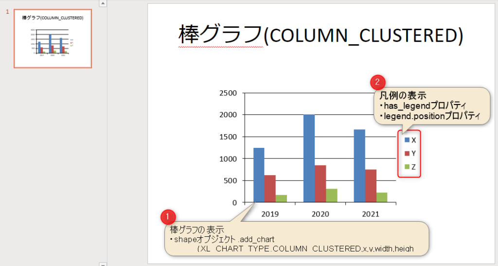 ➀. Python-pptxではグラフをShapeオブジェクトとして管理している。Shapeオブジェクトは、add_chart()メソッド でスライドに追加できる。